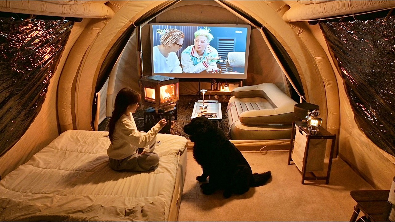 매서운 봄 날씨, 아무도 없는 숲 속을 지키는 모르는 강아지와 아늑한 에어텐트에서 하룻밤